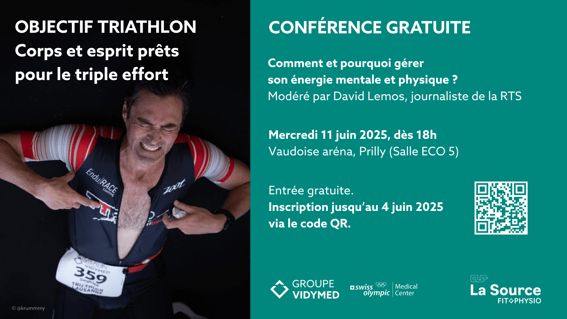 Le Groupe Vidymed et La Source Fitphysio vous invitent à une table ronde gratuite, interactive et interdisciplinaire dédiée à la préparation mentale et physique pour un triathlon. Que vous soyez sportif amateur ou passionné de performance, cet événement est fait pour vous !
