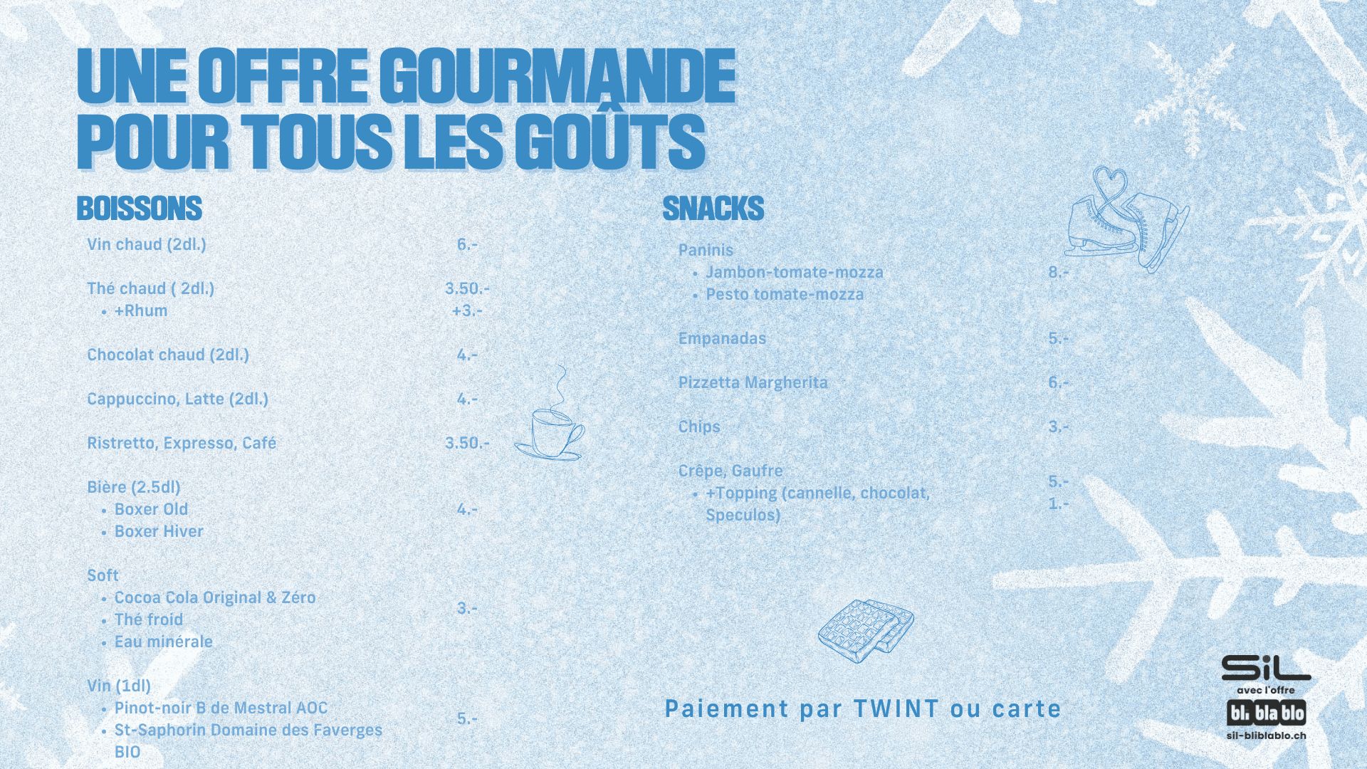 Laissez-vous tenter par une sélection de snacks sucrés et salés préparés sur place : crêpes, gaufres maison, paninis, mini pizzas et chips croustillantes, accompagnés de boissons chaudes (vin chaud, chocolat, thé de Noël) et rafraîchissantes.